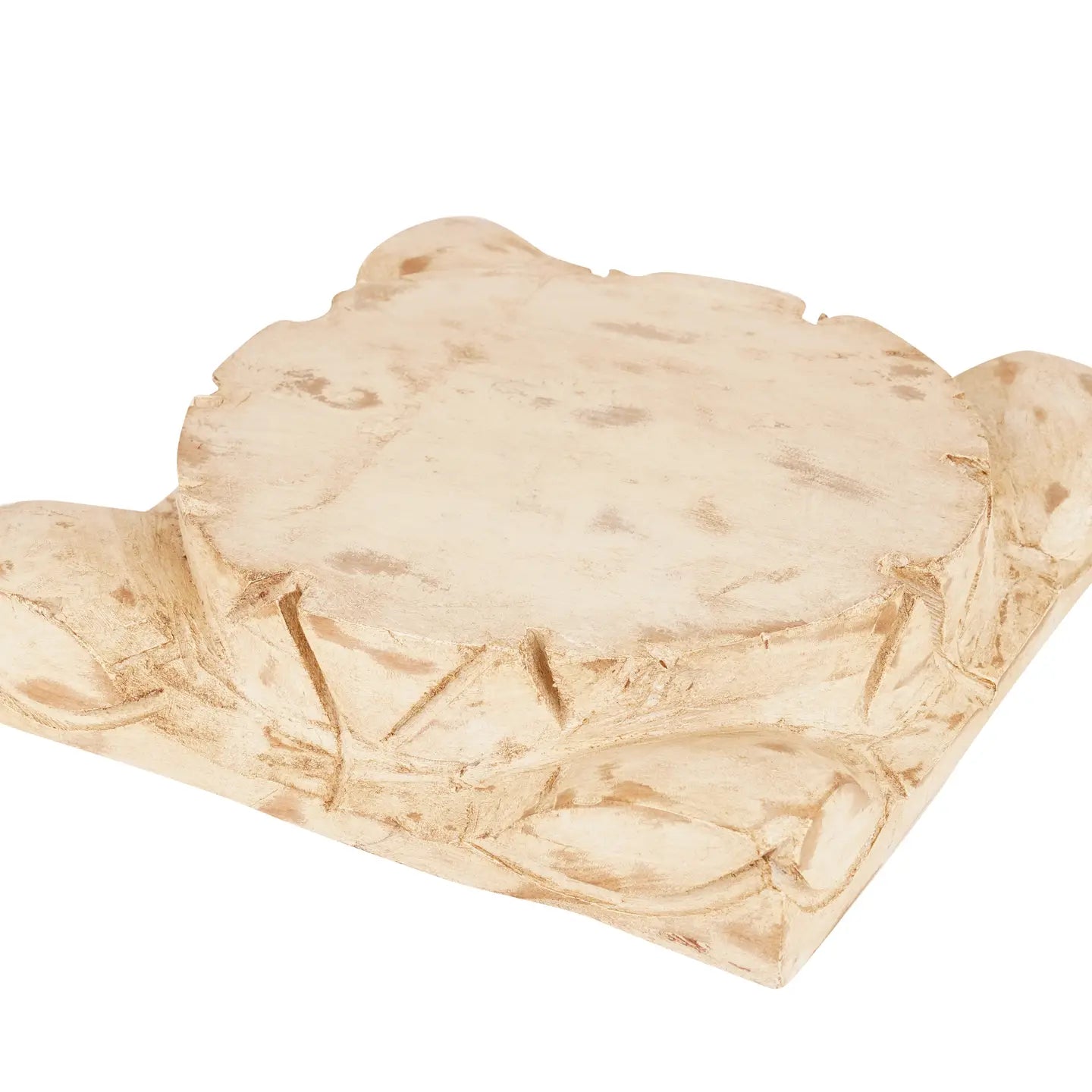 Beautifully sculpted by hand, our carved wooden Farmhouse cake stands are a work of art. Handmade from solid wood and then hand painted in a waxed tone , antiqued white and a clean white tone. These pieces will surely make a scene in your home. This small wooden cake stand measures about 15x15x3.5 inches. Keep in mind that each is hand carved and each one may vary slightly as the tone as well. The beauty is in their uniqueness and one of a kind aspect. Solid Wood Cake Stand-Large Size- 15x15x3.5 inches